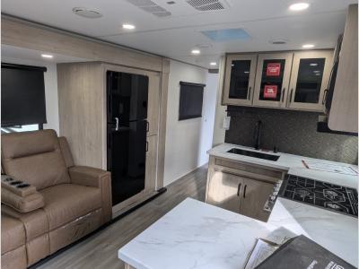 This 25RLE model travel trailer is designed for both comfort and convenience from front to back. At the front, the private bedroom features a spacious 60" x 80" queen bed with built-in wardrobe cubby storage and one of two entry doors for easy access. Moving down the hall, the full bathroom offers a residential-style walk-in shower with a skylight that adds both light and headroom, along with a mirrored medicine cabinet and linen shelves for towels and toiletries. The main living area opens up with a large slide out that houses 60" theater seating and a 10-cu. ft. refrigerator for all your fresh groceries, while a nearby pantry keeps your dry goods organized. Across from the slide, the U-shaped kitchen provides ample counter space, a three-burner range with oven, stainless steel sink, and microwave, everything you need to cook in comfort. At the rear, the booth dinette creates the perfect spot for meals or games and easily converts into an extra-sleeping area when needed.