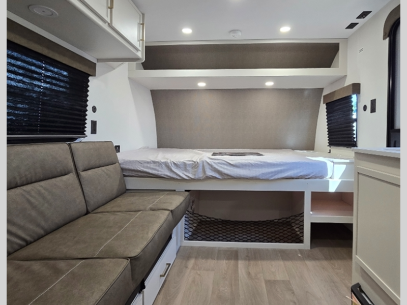 Each model is constructed to a superior standard with an insulated floor and enclosed underbelly plus residential insulated walls that will help with temperature regulation and moisture control. The 6' 6" interior height, tinted windows, and residential cabinet doors will make your space feel a little more like home, and the black automotive glass entry door is ultra sleek. You will find a power awning with a Fusion light outside, along with magnetic storage door catches, a Leash Link/bottle opener, and more convenient features!