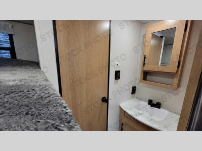 Each model is constructed with a fully enclosed underbelly, a PVC roof membrane, and gold reflective exterior windows that are sure to be eye-catching. The power tongue jack and power stabilizer jacks will have you set up in no-time, and the best-in-class drop frame pass-through storage means you can bring along extra camp gear. Inside, you'll find Congoleum flooring, seamless pressed countertops, a designer bedding package, and many more comforts.