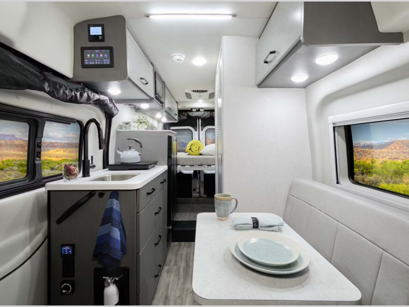 Sleeps 4 Length 20 ft 5 in Ext Width 8 ft 1 in Ext Height 10 ft 2 in Int Height 6 ft 7 in Interior Color Alpine White II, Charcoal Fusion II Exterior Color Avalanche Grey, Carbonized Grey, Oxford White Hitch Weight 6000 lbs GVWR 9500 lbs Fresh Water Capacity 20 gals Grey Water Capacity 20 gals Black Water Capacity 4.75 gals Tire Size 30.5" Furnace BTU 14300 btu Fuel Type Gasoline Engine 3.5L V6 Chassis Ford Transit Trail AWD Horsepower 310 hp Fuel Capacity 31 gals Wheelbase 148 in Torque 400 ft-lb Refrigerator Type Single Door 12V Electric Cooktop Burners 1 Number of Awnings 1 LP Tank Capacity 24.7 lbs Water Heater Capacity 2.64 gal Water Heater Type Truma Combi Eco AC BTU 11000 btu Awning Info 10' Thule Lateral Arm w/ Integrated LED Lighting Gross Combined Weight 12600 lbs Shower Type Wet/Bath Shower Electrical Service 30 amp Similar Floorplans