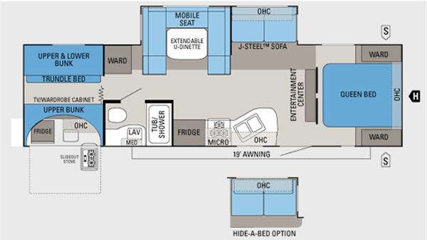 Customer Value Package - ABS tub surround; ABS gas bottle cover; 13,500-BTU A/C with wall thermostat and louvered directional ceiling vents; Microwave oven with carousel; 6-gal gas/electric DSI auto-ignition water heater; Oversized oven; Carefree Travel'r 12 volt electric patio awning; Outside shower; Bathroom power vent; Bi-fold cover for range; Multi-Media Premium Sound System AM/FM/CD/DVD stereo with MP3 input jack