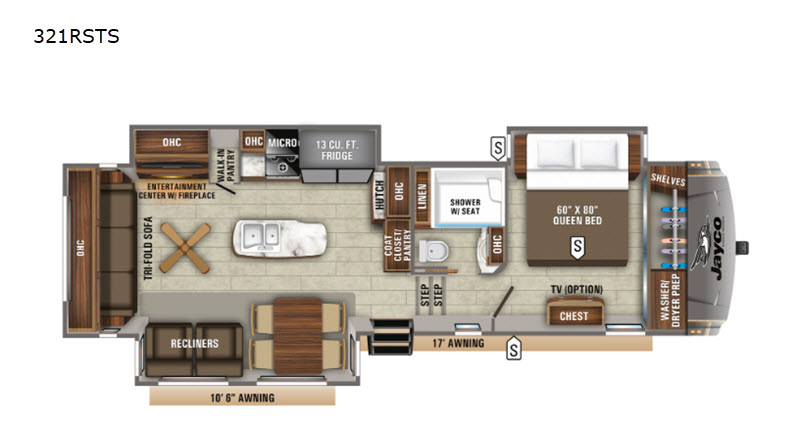 JAYCOMMAND™ "Smart RV" System, Drinking Water System™ (patent-pending), 2nd Power Awning, Washer/Dryer Prep, Soft Close Kitchen Drawers, Sound Bar, 13.5 cu. ft. Gas/Electric Refrigerator, LG® Solid-Surface Kitchen Countertop, LED Fireplace, Frameless Windows
